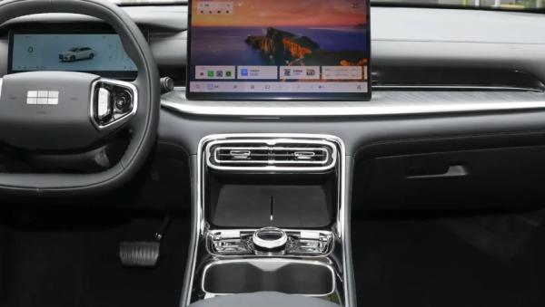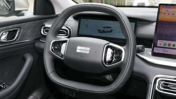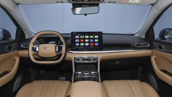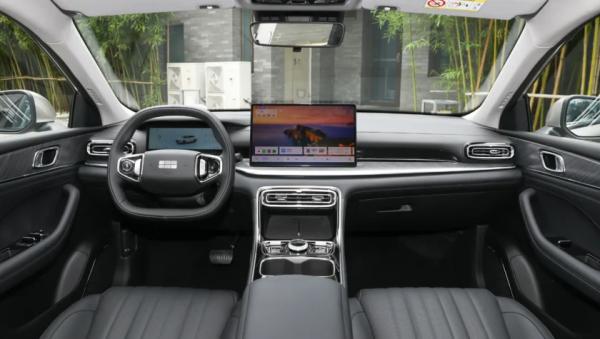 Салон нового седана Geely Galaxy Starshine 6 решен в современном стиле с установленным по центру крупным сенсорным планшетом медиасистемы, а перед водителем двухспицевый руль за которым относительно компактный экран с виртуальными приборами удачно спрятанный под небольшой козырек.